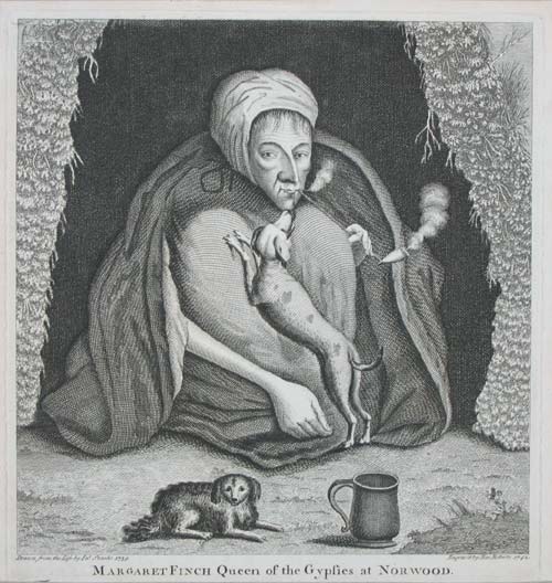 Margaret Finch was the most famous of the Norwood gypsies, who lived in the area now known as Gypsy Hill. A report published a few years after her death states that the ‘oddness of her figure and ye fame of her fortune-telling drew a vast concourse of spectators from ye highest rank of quality, even to those of ye lower class of life’. She lived in a hut built of branches, at the base of an ancient tree, and it was there that great numbers of people visited her. The Norwood Gypsies were so famous that a play, written about them, was performed in Covent Garden in 1777.