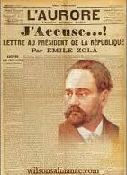 Émile Zola risked his career and more on 13 January 1898, when his “J’accuse“,was published on the front page of the Paris daily L’Aurore. The newspaper was run by Ernest Vaughan and Georges Clemenceau, who decided that the controversial story would be in the form of an open letter to the President, Félix Faure. Émile Zola’s “J’Accuse” accused the highest levels of the French Army of obstruction of justice and antisemitism by having wrongfully convicted Alfred Dreyfus to life imprisonment on Devil’s Island. The case, known as the Dreyfus affair, divided France deeply between the reactionary army and church and the more liberal commercial society. The ramifications continued for many years; on the 100th anniversary of Zola’s article, France’s Roman Catholic daily paper, La Croix, apologized for its antisemitic editorials during the Dreyfus Affair. As Zola was a leading French thinker, his letter formed a major turning-point in the affair.