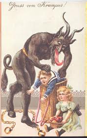 In parts of central Europe like Austria, Germany, and Switzerland, the character of Black Peter was a more like a monster, with horns, long hair, and a red tongue. He was known by a variety of names: Klaubauf, Krampus, Grampus, Bartel. St. Nicholas sent naughty children to him to be beaten.