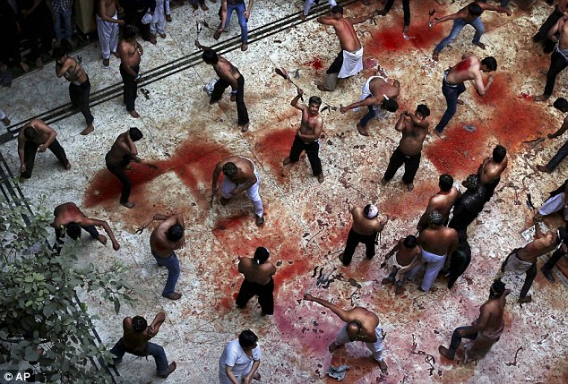 Indian Shiite Muslims flagellate themselves during a holy procession.